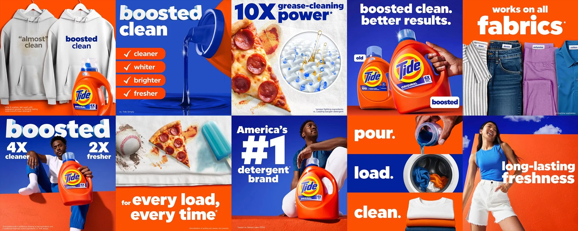 Tide has long stood for performance, but the category around it had changed. Value brands had become good enough, premium options promised specialization, and modern wardrobes were no longer made of cotton alone. With synthetics, athleisure, and technical fabrics now defining everyday wear, Tide boosted its core formula to perform for the way people live and dress today — without breaking the trust that made it a category leader. Our work brought that evolution to life at commerce, translating technical improvement into confident, familiar visuals and experiences that reinforced Tide’s leadership while making its relevance unmistakably modern.