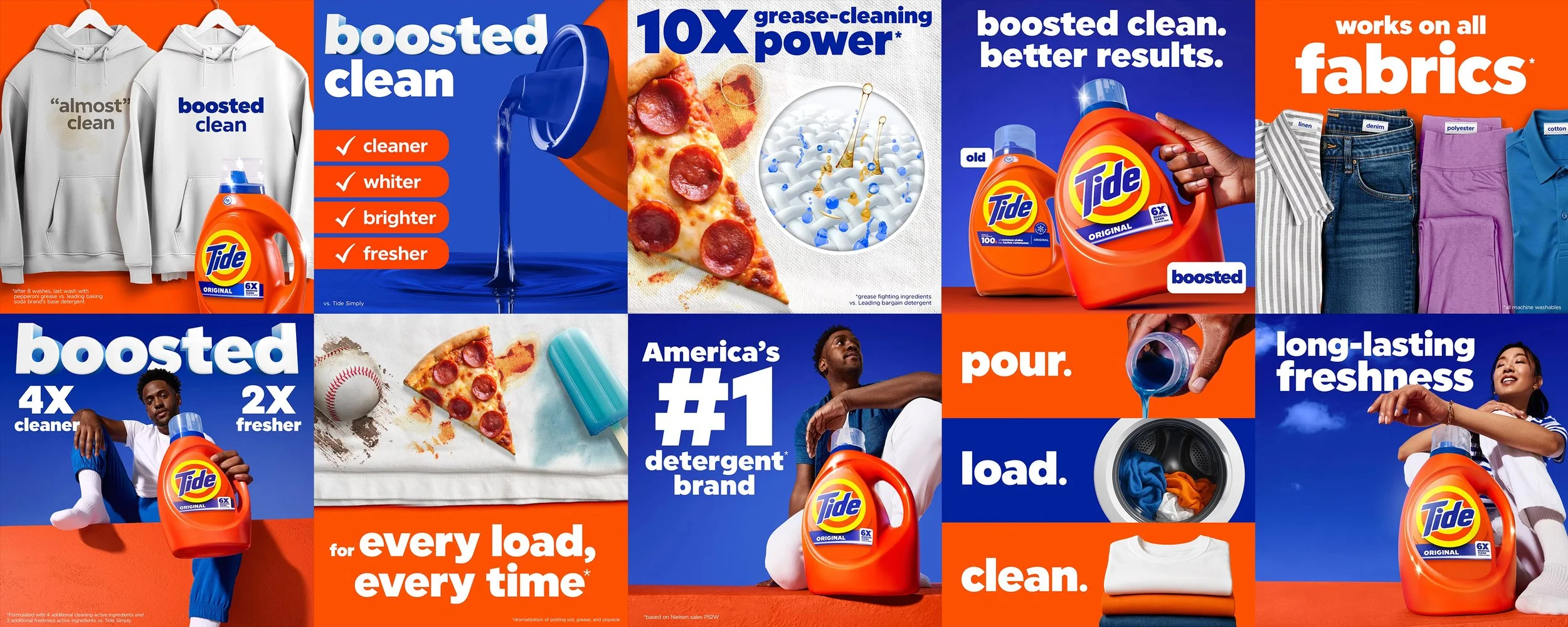 Tide has long stood for performance, but the category around it had changed. Value brands had become good enough, premium options promised specialization, and modern wardrobes were no longer made of cotton alone. With synthetics, athleisure, and technical fabrics now defining everyday wear, Tide boosted its core formula to perform for the way people live and dress today - without breaking the trust that made it a category leader. Our work brought that evolution to life at commerce, translating technical improvement into confident, familiar visuals and experiences that reinforced Tide’s leadership while making its relevance unmistakably modern.